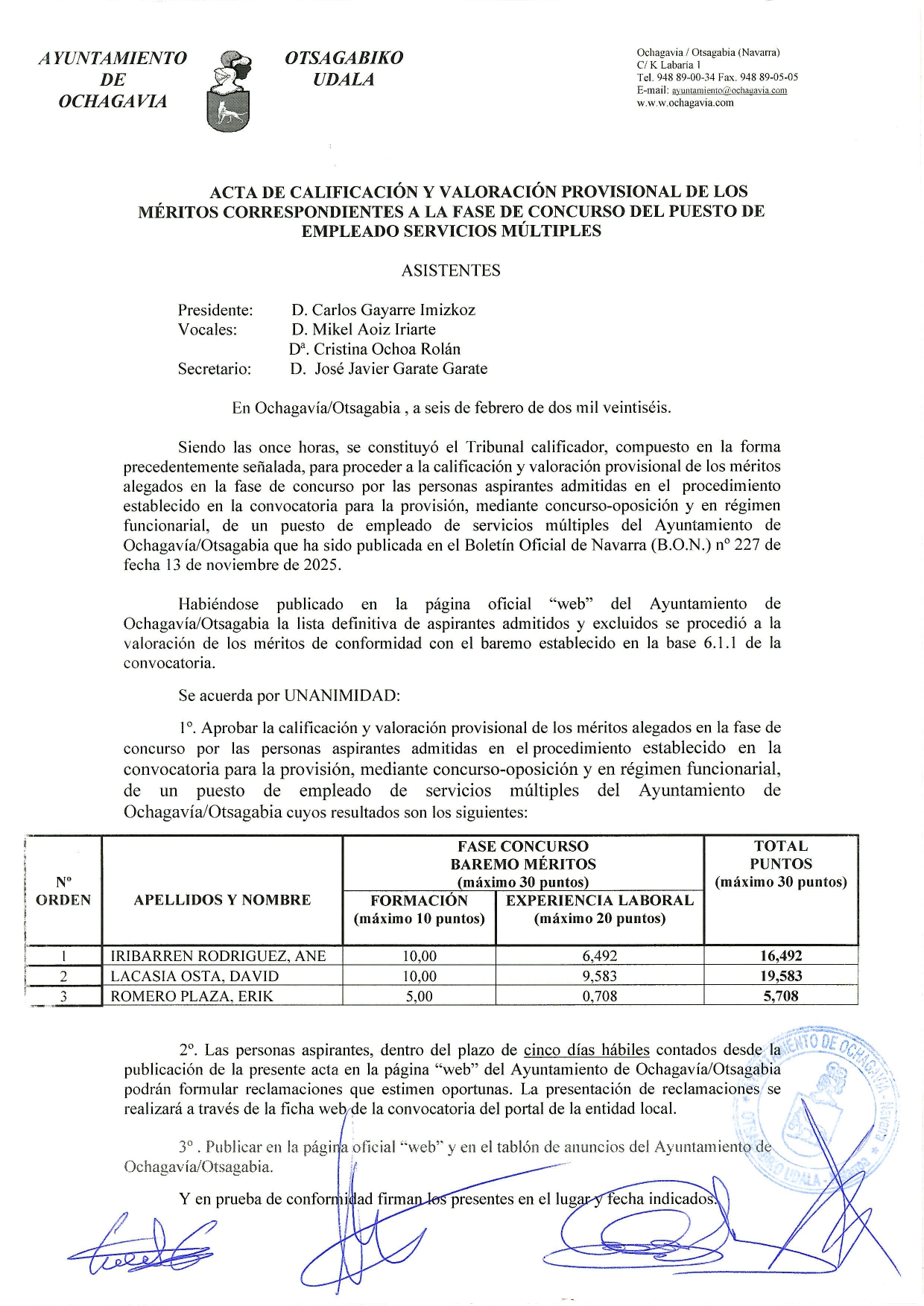 Acta de méritos provisional – Puesto de empleado/a de servicios múltiples