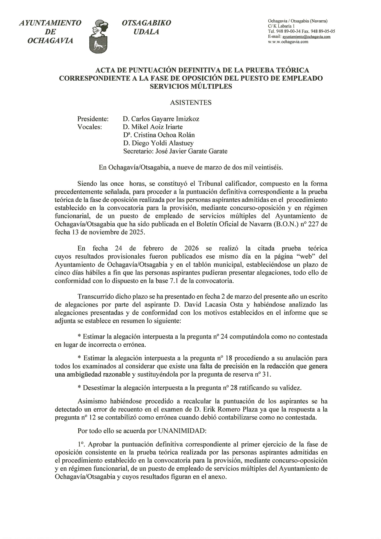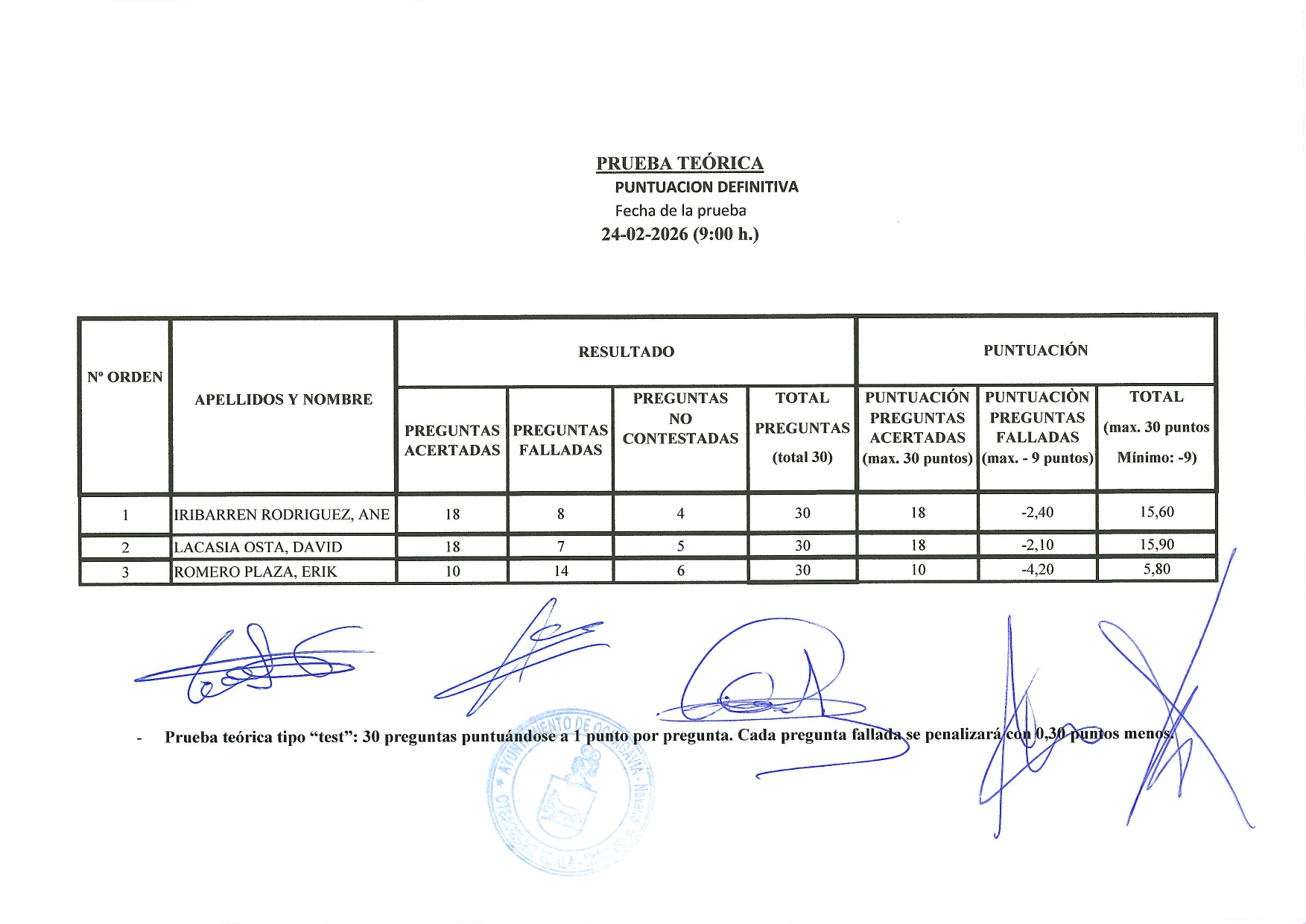 - Puntuación definitiva de la prueba teórica correspondiente a la fase de oposición del puesto de empleado/a de servicios multiples